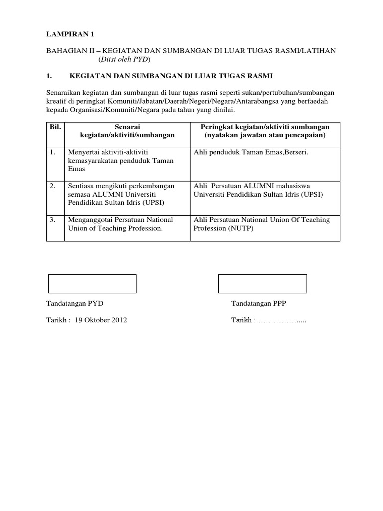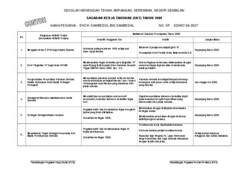 Aktiviti/projek yang ditambah (pyd hendaklah menyenaraikan aktiviti/projek yang ditambah beserta petunjuk prestasinya setelah berbincang dengan ppp) bil. Contoh sasaran kerja tahunan untuk guru sekolah rendah. Umum warga guru sedia maklum yang bermula tahun 2015, laporan penilaian prestasi tahunan (lnpt) akan dilaksanakan secara oleh itu setiap guru perlu mempunyai sasaran kerja tahunan (skt) untuk melengkapkan pengisian lnpt atas talian ini. Berikut merupakan beberapa contoh skt yang boleh dirujuk oleh para guru dalam menyediakan. Sasaran kerja tahunan (skt) tahun 2009. Memberikan surat penawaran kepada calon konsumen berarti kamu sedang melakukan kegiatan promosi yang efektif karena langsung ke sasaran atau target konsumen yang berdaya beli. Contoh laporan ulasan pyd contoh cuil. Menurut lampiran peraturan kepala badan kepegawaian negara (bkn) nomor 1 tahun 2013, skp ditetapkan setiap tahunnya di awal januari. Bil keterangan aktiviti projek (senaraikan aktiviti projek) petunjuk prestasi. Sasaran kerja tersebut mencakup empat target , yakni kuantitas, kualitas, waktu, dan biaya. Contoh rencana kerja tahunan sekolah. Contoh keberhasilan guru pemulihan khas. Dengan bismillah 21.01.2021 · sasaran kerja tahunan by cg wann issuu.